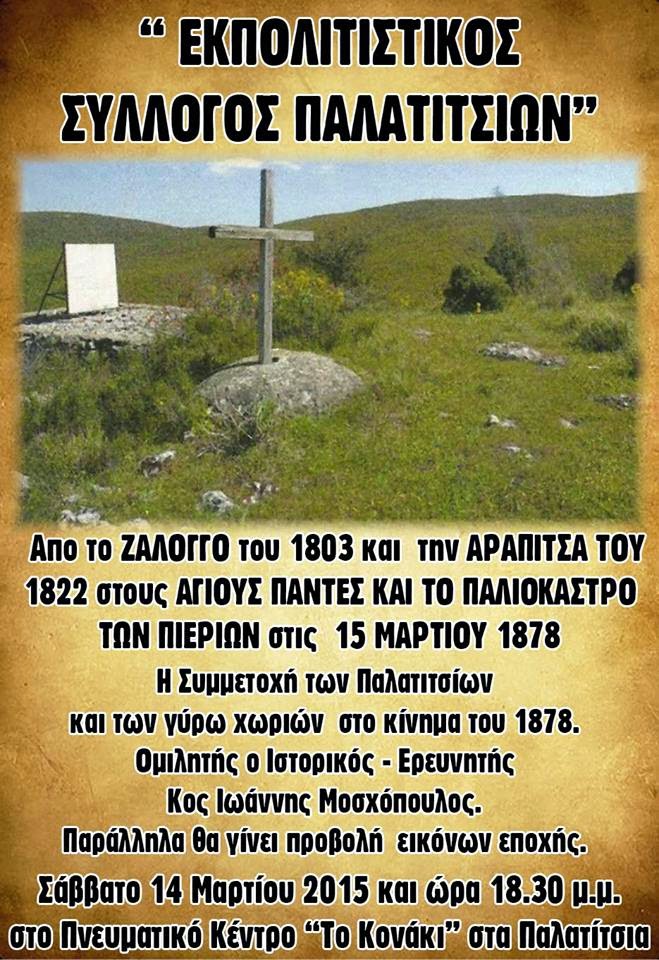 O Εκπολιτιστικός Σύλλογος Παλατιτσίων διοργανώνει εκδήλωση για το Επαναστατικό Κίνημα του 1878.