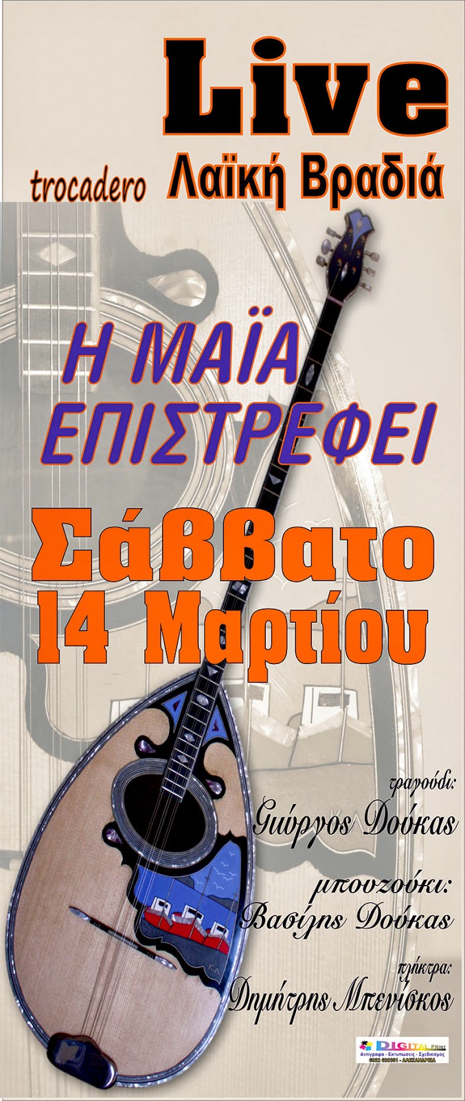 Στο τραγούδι και σήμερα θα είναι ο Γιώργος Δούκας, στο μπουζούκι ο Βασίλης Δούκας και στα πλήκτρα ο Δημήτρης Μπενίσκος.