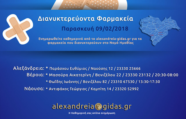 ΤΟΠΙΚΑ 9 Φεβρουαρίου, 2018 posted by admin Share Εφημερεύοντα – διανυκτερεύοντα φαρμακεία Ημαθίας Παρασκευή 9 Φεβρουαρίου Αλεξάνδρεια: Αφήστε μια απάντηση Ακύρωση απάντησηςΗ ηλ. διεύθυνση σας δεν δημοσιεύεται. Τα υποχρεωτικά πεδία σημειώνονται με *Σχόλιο * Όνομα Email Ιστότοπος Αποθήκευσε το όνομά μου, email, και τον ιστότοπο μου σε αυτόν τον πλοηγό για την επόμενη φορά που θα σχολιάσω.