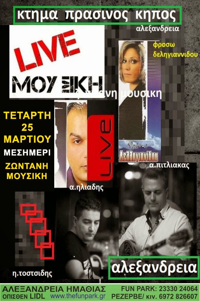 Ο ΠΡΑΣΙΝΟΣ ΚΗΠΟΣ στην Αλεξάνδρεια σας προσκαλεί την Τετάρτη 25η Μαρτίου στον όμορφο χώρο του μετά την παρέλαση με τις μοναδικά υπέροχες γεύσεις του και ζωντανό μουσικό πρόγραμμα!