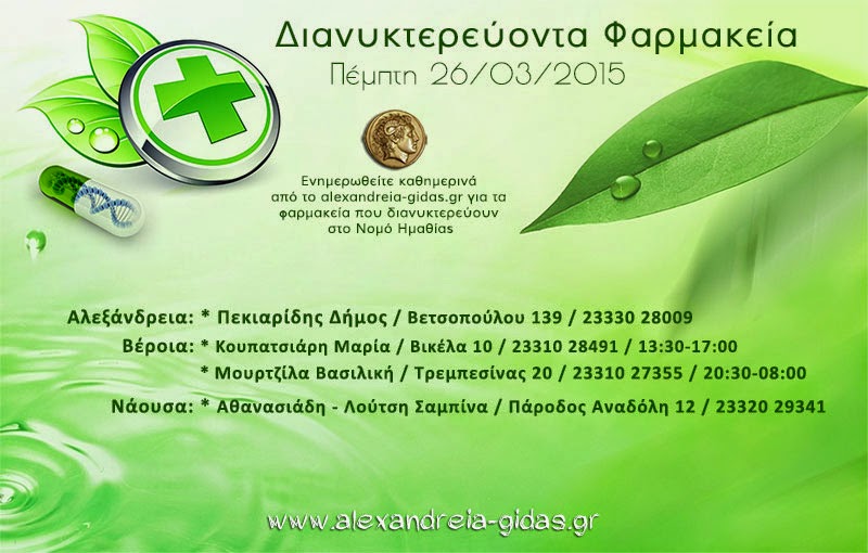 ΤΟΠΙΚΑ 26 Μαρτίου, 2015 posted by admin Share Εφημερεύοντα – διανυκτερεύοντα φαρμακεία Ημαθίας Πέμπτη 26 Μαρτίου Αλεξάνδρεια: Αφήστε μια απάντηση Ακύρωση απάντησηςΗ ηλ. διεύθυνση σας δεν δημοσιεύεται. Τα υποχρεωτικά πεδία σημειώνονται με *Σχόλιο * Όνομα Email Ιστότοπος Αποθήκευσε το όνομά μου, email, και τον ιστότοπο μου σε αυτόν τον πλοηγό για την επόμενη φορά που θα σχολιάσω.