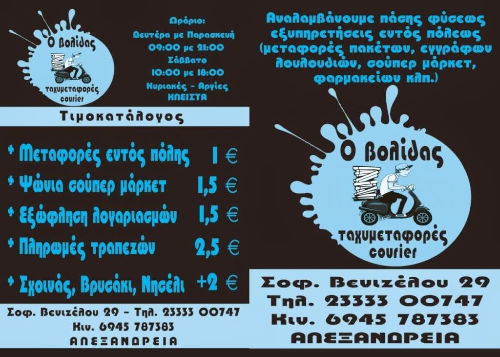 Ο ΒΟΛΙΔΑΣ μπορεί να μεταφέρει τις επιστολές και τα δέματά σας εντός πόλης και εντός του δήμου Αλεξάνδρειας.