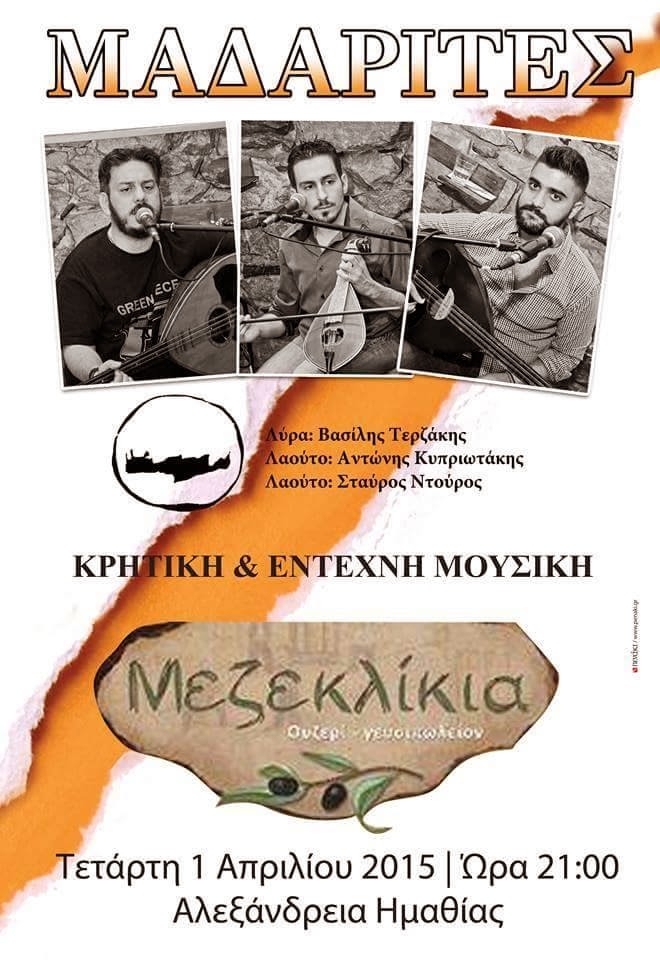 Μία βραδιά με Κρητική και Έντεχνη μουσική διοργανώνει σήμερα Τετάρτη στις 21:00 το Τσιπουράδικο ΜΕΖΕΚΛΙΚΙΑ στον πεζόδρομο Αλεξάνδρειας.