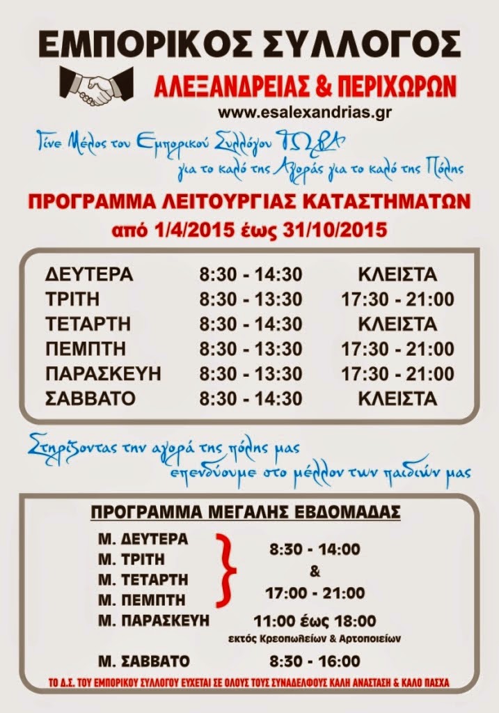 ΤΟΠΙΚΑ 6 Απριλίου, 2015 posted by admin Share Ανοιχτά μέχρι τις 21:00 τα μαγαζιά σήμερα στην Αλεξάνδρεια – δείτε πως θα δουλέψουν τη Μ. Βδομάδα Από 1 Απριλίου ισχύει το θερινό πρόγραμμα λειτουργίας των καταστημάτων της πόλης μας. Δείτε πως θα δουλέψουν τα μαγαζιά στη διάρκεια της Μεγάλης Εβδομάδας: Αφήστε μια απάντηση Ακύρωση απάντησηςΗ ηλ. διεύθυνση σας δεν δημοσιεύεται. Τα υποχρεωτικά πεδία σημειώνονται με *Σχόλιο * Όνομα Email Ιστότοπος Αποθήκευσε το όνομά μου, email, και τον ιστότοπο μου σε αυτόν τον πλοηγό για την επόμενη φορά που θα σχολιάσω.