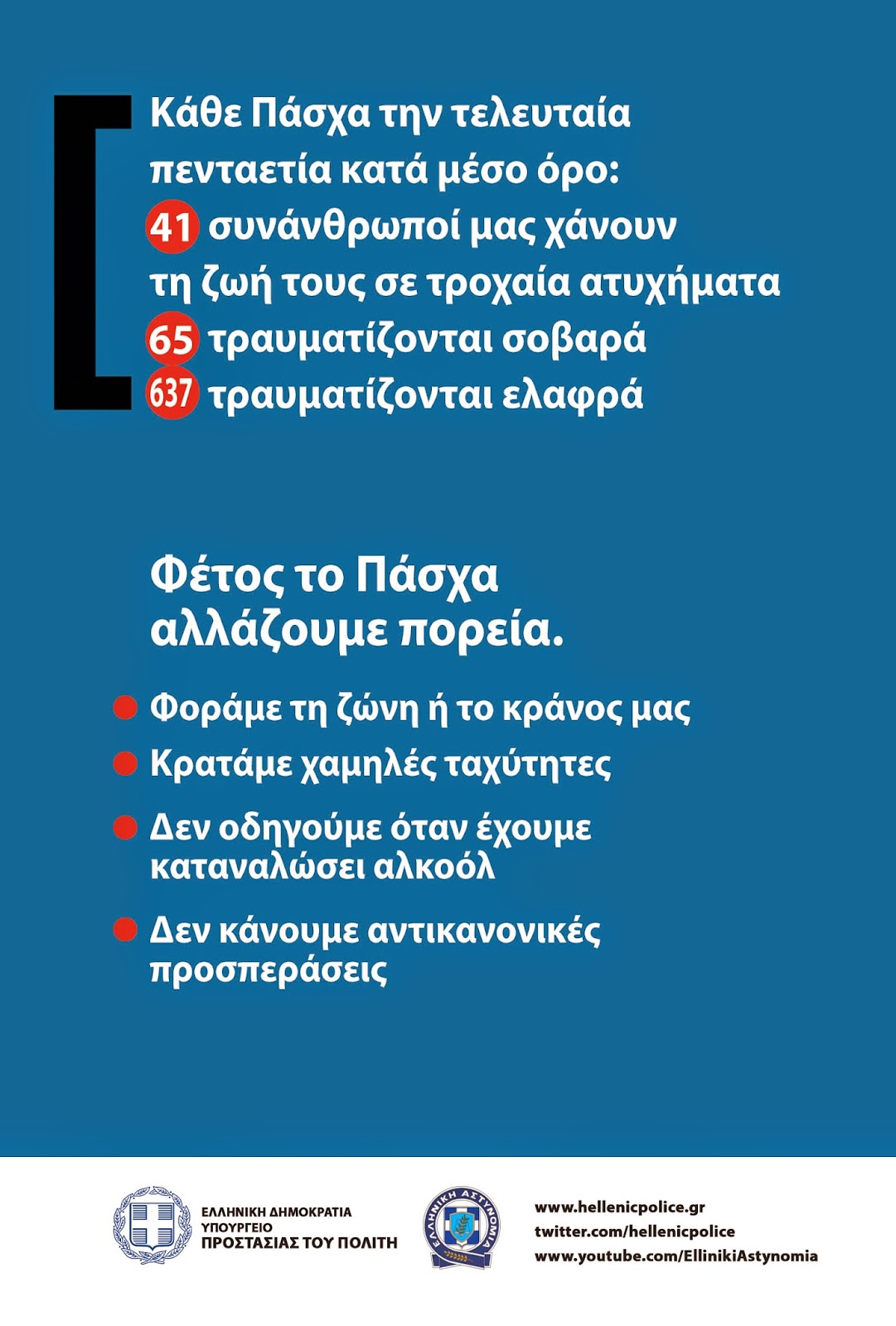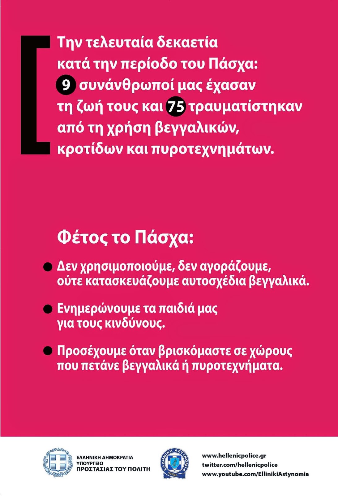 Το Υπουργείο Προστασίας του Πολίτη και το Αρχηγείο της Ελληνικής Αστυνομίας αποφάσισαν, ενόψει των εορτών του Πάσχα, τη διανομή στους πολίτες ενημερωτικών φυλλαδίων με συμβουλές για την οδική ασφάλεια και την αποφυγή χρήσης κροτίδων, βεγγαλικών και πυροτεχνημάτων.