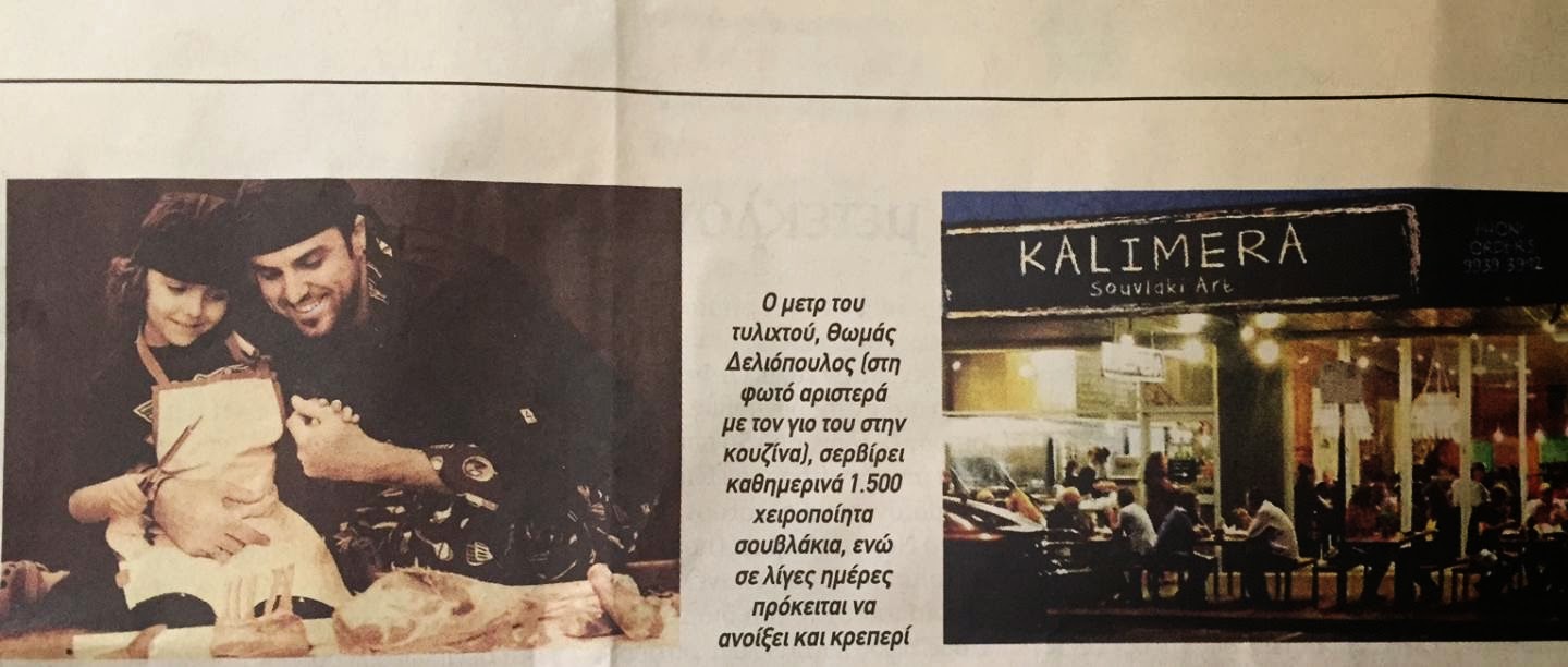 Στη συνοικία Όκλεϊ, στη Μελβούρνη, βρίσκεται το “Kalimera”, ένα σουβλατζίδικο προχωρημένου design, με καρούλια της ΔΕΗ για τραπεζάκια, που έγινε “μαγνήτης” των καλοφαγάδων. Εκεί, ο μετρ του τυλιχτού παρασκευάζει και σερβίρει καθημερινά 1.500 χειροποίητα σουβλάκια, ενώ σε λίγες ημέρες πρόκειται να ανοίξει και το δεύτερο κατάστημά του, την κρεπερί “Mykonos”.
