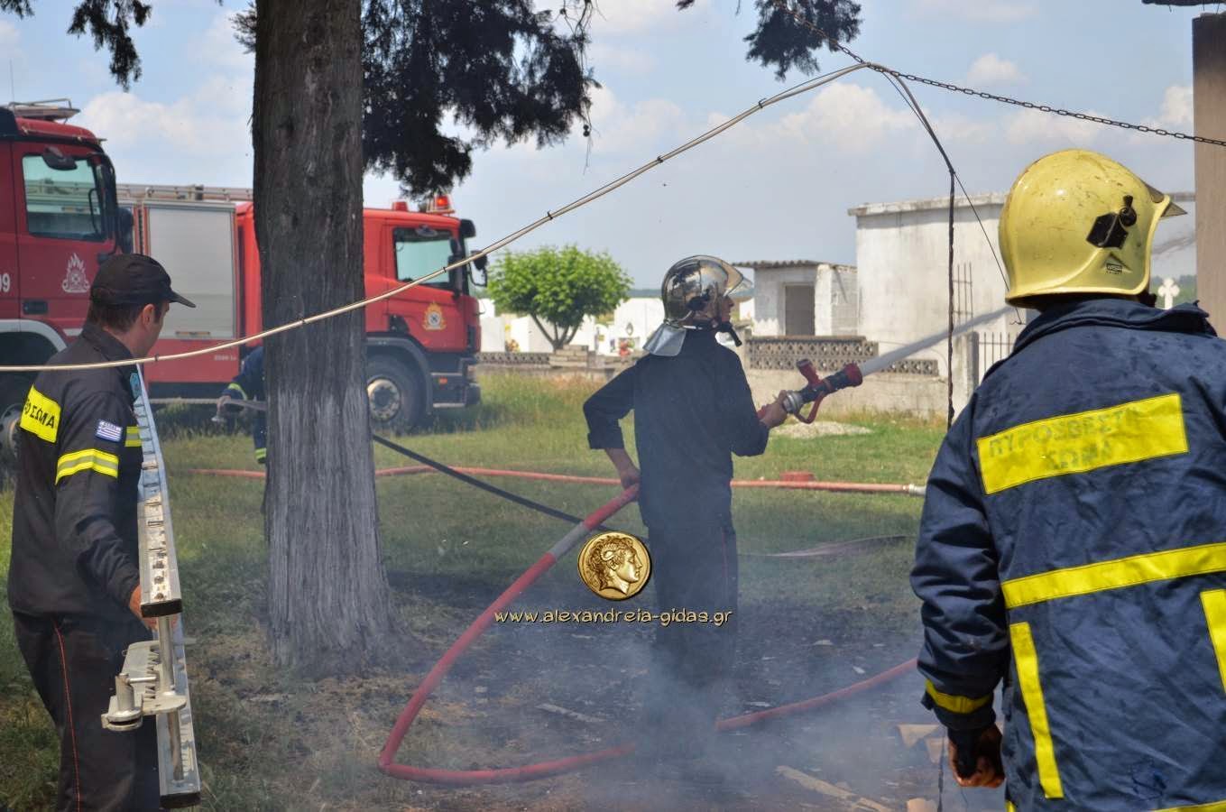Φωτιά ξέσπασε σε εκκλησάκι των κοιμητηρίων της Αγίας Τριάδας του δήμου Αλεξάνδρειας όπως αναφέραμε σε προηγούμενη ανάρτησή μας.