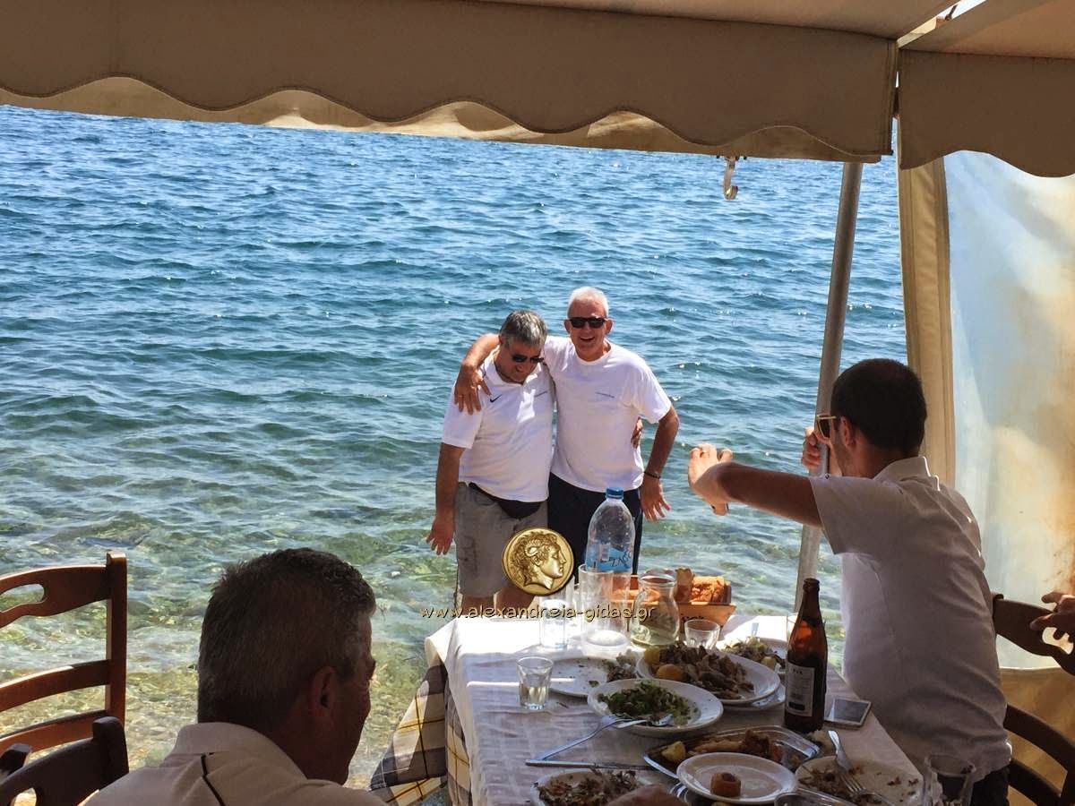 Πάντα «όλα τα λεφτά» για μας τους Παλαίμαχους είναι το τρίτο ημίχρονο. Στην παραλία της Αγριάς στο τσιπουράδικο ΑΚΡΟΓΙΑΛΙ, ήπιαμε τα τσίπουρά μας, φάγαμε τα ψαράκια μας, μιλήσαμε, γελάσαμε, τραγουδήσαμε. Κυριάρχησε βέβαια ο Μέκκας τον οποίο επισκέφτηκαν πολλοί παλιοί του φίλοι. Επίσκεψη είχε και ο Οδυσσέας Καλυβιώτης, από τον χωριανό του τον Γιοβανόπουλο που μένει στο Βόλο. Αφού πέρασαν τέσσερες ώρες στο τσιπουράδικο και αφού γλυτώσαμε τη βουτιά στη θάλασσα, σηκωθήκαμε για να επιστρέψουμε, αφού πρώτα ευχαριστήσαμε τους φίλους της Αγριάς και αφού όλοι μας επιβεβαιώσαμε ότι είχαμε μία άψογη φιλοξενία από κάθε άποψη. Υπήρξε ανοιχτή πρόσκληση να επισκεφθούν την Αλεξάνδρεια , όποτε θελήσουν. Ήπιαμε έναν καφέ στο ΔΙΑΤΗΡΗΤΕΟΝ για να συνέλθουμε και πήραμε σιγά-σιγά τον δρόμο της επιστροφής.