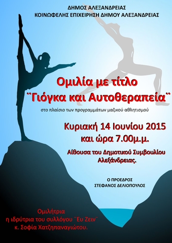 Η Κοινωφελής Επιχείρηση δήμου Αλεξάνδρειας, στο πλαίσιο των προγραμμάτων μαζικού αθλητισμού, σας προσκαλεί την Κυριακή 14 Ιουνίου 2015 και ώρα 7:00μ.μ., στην ομιλία με τίτλο “Γιόγκα και Αυτοθεραπεία” που θα πραγματοποιηθεί στην… αίθουσα του Δημοτικό Συμβουλίου Αλεξάνδρειας.