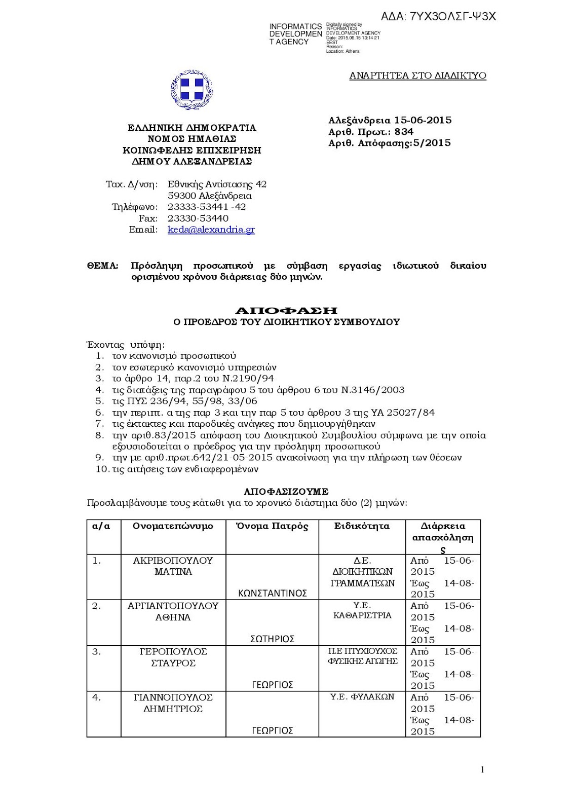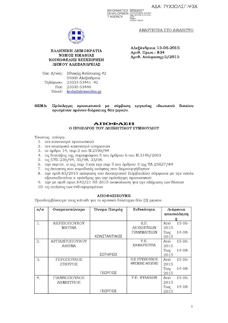 kolymvitirio (Αντιγραφή)Ανακοινώνονται τα ονόματα των προσληφθέντων με σύμβαση εργασίας ορισμένου χρόνου, διάρκειας δύο μηνών από την Κοινωφελή Επιχείρηση του Δήμου Αλεξάνδρειας.
