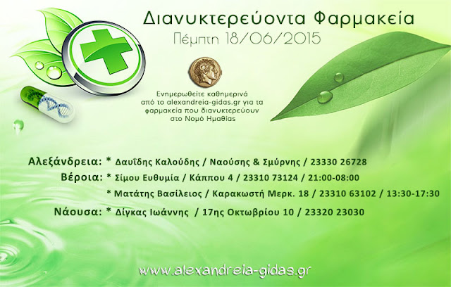 ΤΟΠΙΚΑ 18 Ιουνίου, 2015 posted by admin Share Εφημερεύοντα – διανυκτερεύοντα φαρμακεία Ημαθίας Πέμπτη 18/06 Αλεξάνδρεια: Αφήστε μια απάντηση Ακύρωση απάντησηςΗ ηλ. διεύθυνση σας δεν δημοσιεύεται. Τα υποχρεωτικά πεδία σημειώνονται με *Σχόλιο * Όνομα Email Ιστότοπος Αποθήκευσε το όνομά μου, email, και τον ιστότοπο μου σε αυτόν τον πλοηγό για την επόμενη φορά που θα σχολιάσω.