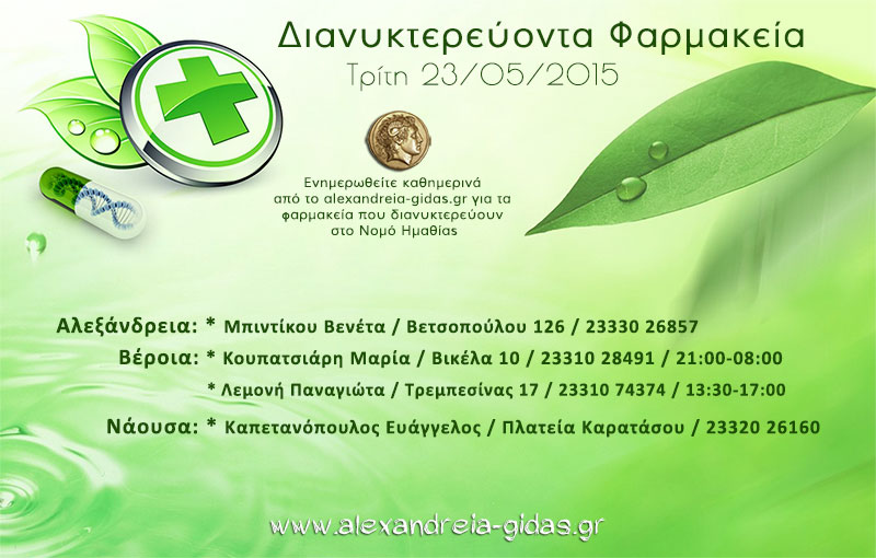 ΤΟΠΙΚΑ 23 Ιουνίου, 2015 posted by admin Share Εφημερεύοντα – διανυκτερεύοντα φαρμακεία Ημαθίας Τρίτη 23 Ιουνίου Αλεξάνδρεια: Αφήστε μια απάντηση Ακύρωση απάντησηςΗ ηλ. διεύθυνση σας δεν δημοσιεύεται. Τα υποχρεωτικά πεδία σημειώνονται με *Σχόλιο * Όνομα Email Ιστότοπος Αποθήκευσε το όνομά μου, email, και τον ιστότοπο μου σε αυτόν τον πλοηγό για την επόμενη φορά που θα σχολιάσω.