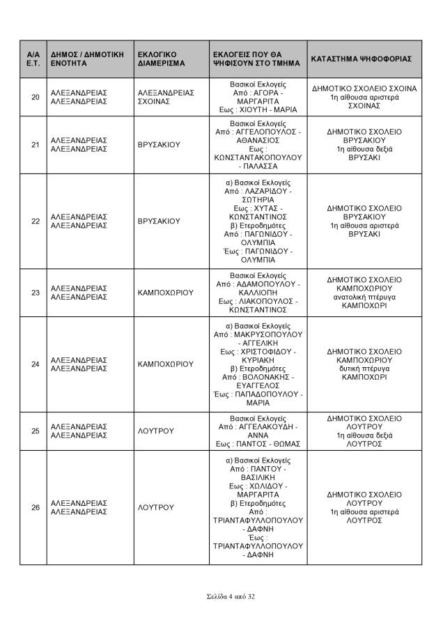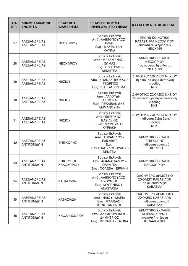 Καθορίζουμε τα εκλογικά τμήματα και τα καταστήματα ψηφοφορίας της εκλογικής περιφέρειας του Νομού Ημαθίας, στα οποία θα ψηφίσουν στο δημοψήφισμα της 5ης Ιουλίου 2015, οι εκλογείς που είναι γραμμένοι στους βασικούς εκλογικούς καταλόγους των Δήμων του Νομού Ημαθίας, στους ειδικούς εκλογικούς καταλόγους των ετεροδημοτών και ειδικούς εκλογικούς καταλόγους του αρθ.27 του Π.Δ. 26/2012 (Στρατιωτικοί, Ελληνική Αστυνομία, Πυροσβεστικό Σώμα) ως κατωτέρω στον δήμο Αλεξάνδρειας: