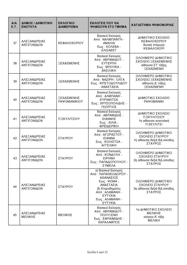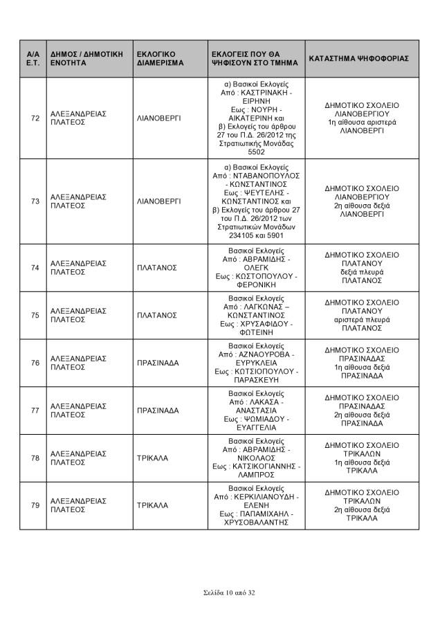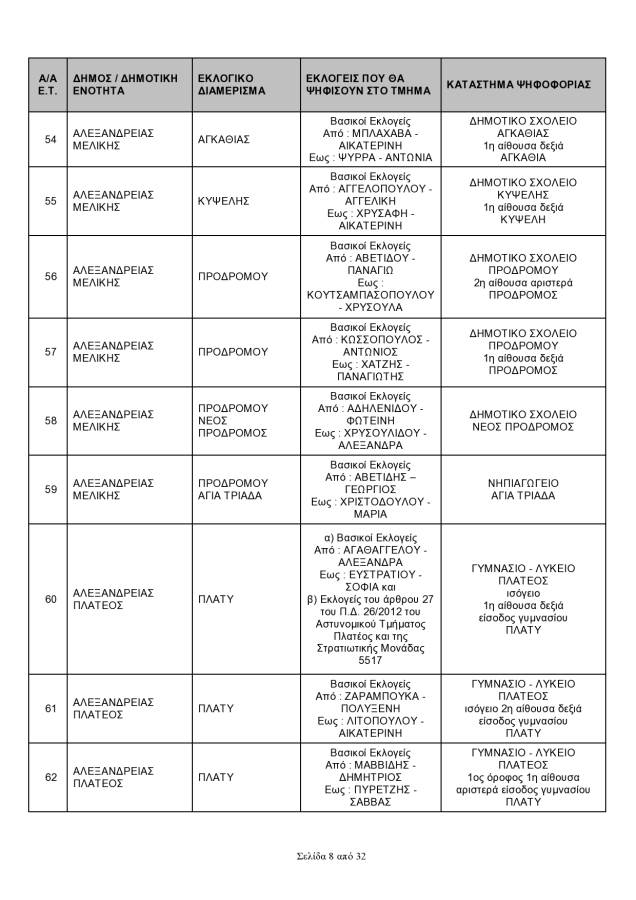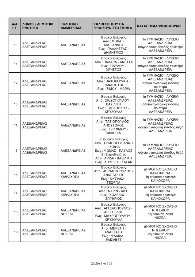 Καθορίζουμε τα εκλογικά τμήματα και τα καταστήματα ψηφοφορίας της εκλογικής περιφέρειας του Νομού Ημαθίας, στα οποία θα ψηφίσουν στο δημοψήφισμα της 5ης Ιουλίου 2015, οι εκλογείς που είναι γραμμένοι στους βασικούς εκλογικούς καταλόγους των Δήμων του Νομού Ημαθίας, στους ειδικούς εκλογικούς καταλόγους των ετεροδημοτών και ειδικούς εκλογικούς καταλόγους του αρθ.27 του Π.Δ. 26/2012 (Στρατιωτικοί, Ελληνική Αστυνομία, Πυροσβεστικό Σώμα) ως κατωτέρω στον δήμο Αλεξάνδρειας: