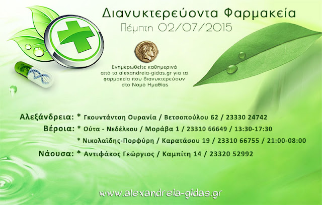 ΤΟΠΙΚΑ 2 Ιουλίου, 2015 posted by admin Share Εφημερεύοντα – διανυκτερεύοντα φαρμακεία Ημαθίας Πέμπτη 2 Ιουλίου Αλεξάνδρεια: Αφήστε μια απάντηση Ακύρωση απάντησηςΗ ηλ. διεύθυνση σας δεν δημοσιεύεται. Τα υποχρεωτικά πεδία σημειώνονται με *Σχόλιο * Όνομα Email Ιστότοπος Αποθήκευσε το όνομά μου, email, και τον ιστότοπο μου σε αυτόν τον πλοηγό για την επόμενη φορά που θα σχολιάσω.