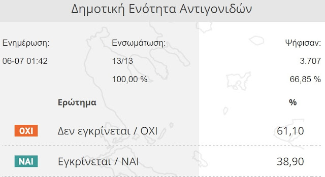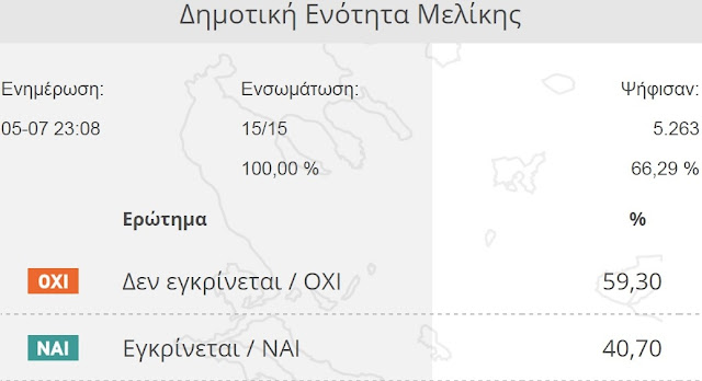 telikoapotelΤο ποσοστό του 62,75% έφτασε το ΟΧΙ στον δήμο Αλεξάνδρειας στο δημοψήφισμα της Κυριακής 5 Ιουλίου.