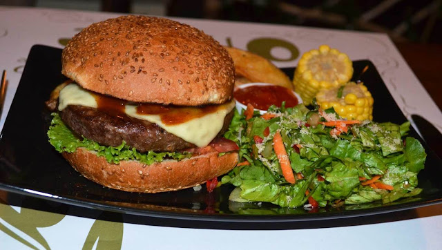 Black Angus Burger με ρόκα, τηγανητές πατάτες και πράσινη σαλάτα