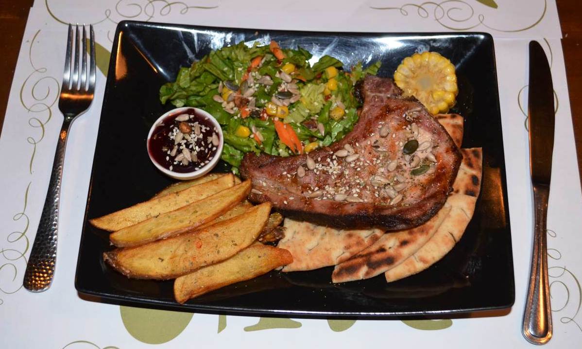 Καπνιστή μπριζόλα στη σχάρα με σαλάτα ξηρών καρπών και βαλσάμικο, πιτούλες και σάλτσα βύσσινο