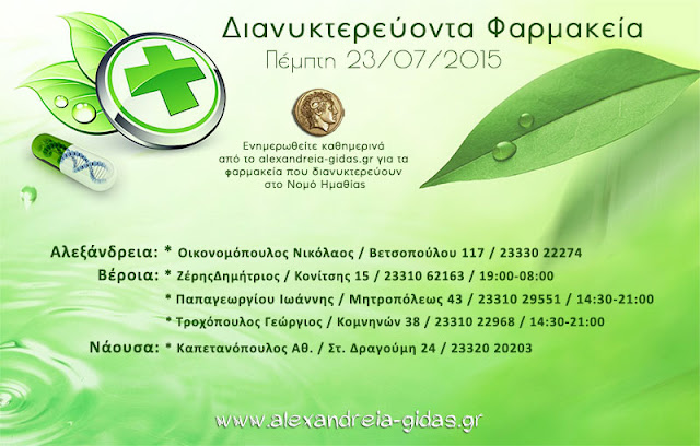 ΤΟΠΙΚΑ 23 Ιουλίου, 2015 posted by admin Share Εφημερεύοντα – διανυκτερεύοντα φαρμακεία Ημαθίας Πέμπτη 23 Ιουλίου Αλεξάνδρεια: Αφήστε μια απάντηση Ακύρωση απάντησηςΗ ηλ. διεύθυνση σας δεν δημοσιεύεται. Τα υποχρεωτικά πεδία σημειώνονται με *Σχόλιο * Όνομα Email Ιστότοπος Αποθήκευσε το όνομά μου, email, και τον ιστότοπο μου σε αυτόν τον πλοηγό για την επόμενη φορά που θα σχολιάσω.