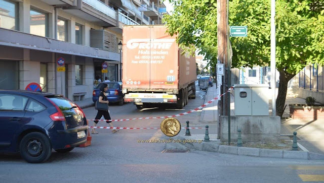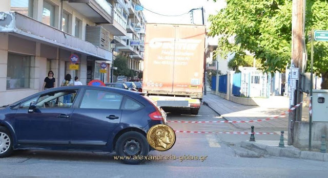 Κλειστή είναι η είσοδος στην οδό Αλ. Παπάγου στην Αλεξάνδρεια από την στροφή του Αστυνομικού Τμήματος Αλεξάνδρειας. Μπροστά στο τμήμα υπάρχει μία νταλίκα με ξένες πινακίδες ενώ ο οδηγός της βουλγάρικης καταγωγής βρίσκεται στο τμήμα.