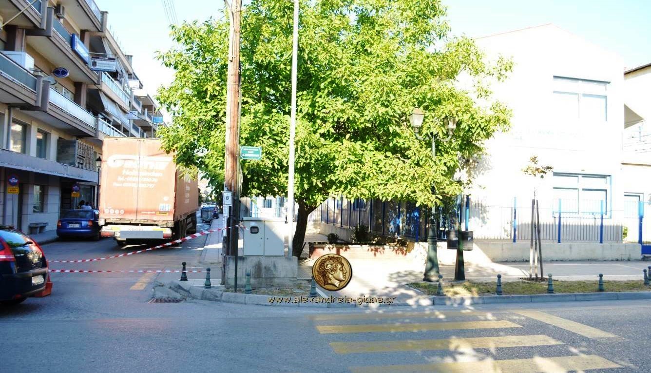 DSC_1310 (Αντιγραφή)Κλειστή είναι η είσοδος στην οδό Αλ. Παπάγου στην Αλεξάνδρεια από την στροφή του Αστυνομικού Τμήματος Αλεξάνδρειας. Μπροστά στο τμήμα υπάρχει μία νταλίκα με ξένες πινακίδες ενώ ο οδηγός της βουλγάρικης καταγωγής βρίσκεται στο τμήμα.