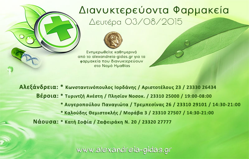 ΤΟΠΙΚΑ 3 Αυγούστου, 2015 posted by admin Share Εφημερεύοντα – διανυκτερεύοντα φαρμακεία Ημαθίας Δευτέρα 3 Αυγούστου Αλεξάνδρεια: Αφήστε μια απάντηση Ακύρωση απάντησηςΗ ηλ. διεύθυνση σας δεν δημοσιεύεται. Τα υποχρεωτικά πεδία σημειώνονται με *Σχόλιο * Όνομα Email Ιστότοπος Αποθήκευσε το όνομά μου, email, και τον ιστότοπο μου σε αυτόν τον πλοηγό για την επόμενη φορά που θα σχολιάσω.
