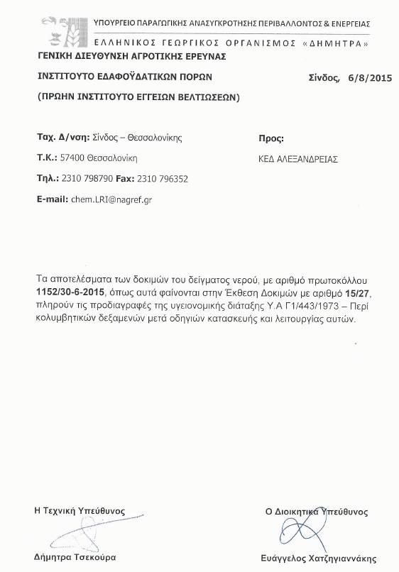 Αυτό ανακοινώθηκε με σημερινό έγγραφο του Ινστιτούτου Εδαφοϋδατικών πόρων (πρώην Ινστιτούτο εγγείων βελτιώσεων) το οποίο κοινοποιήθηκε στην Κοινωφελή Επιχείρηση του δήμου Αλεξάνδρειας.