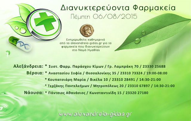 ΤΟΠΙΚΑ 6 Αυγούστου, 2015 posted by admin Share Εφημερεύοντα – διανυκτερεύοντα φαρμακεία Ημαθίας Πέμπτη 6 Αυγούστου Αλεξάνδρεια: Αφήστε μια απάντηση Ακύρωση απάντησηςΗ ηλ. διεύθυνση σας δεν δημοσιεύεται. Τα υποχρεωτικά πεδία σημειώνονται με *Σχόλιο * Όνομα Email Ιστότοπος Αποθήκευσε το όνομά μου, email, και τον ιστότοπο μου σε αυτόν τον πλοηγό για την επόμενη φορά που θα σχολιάσω.