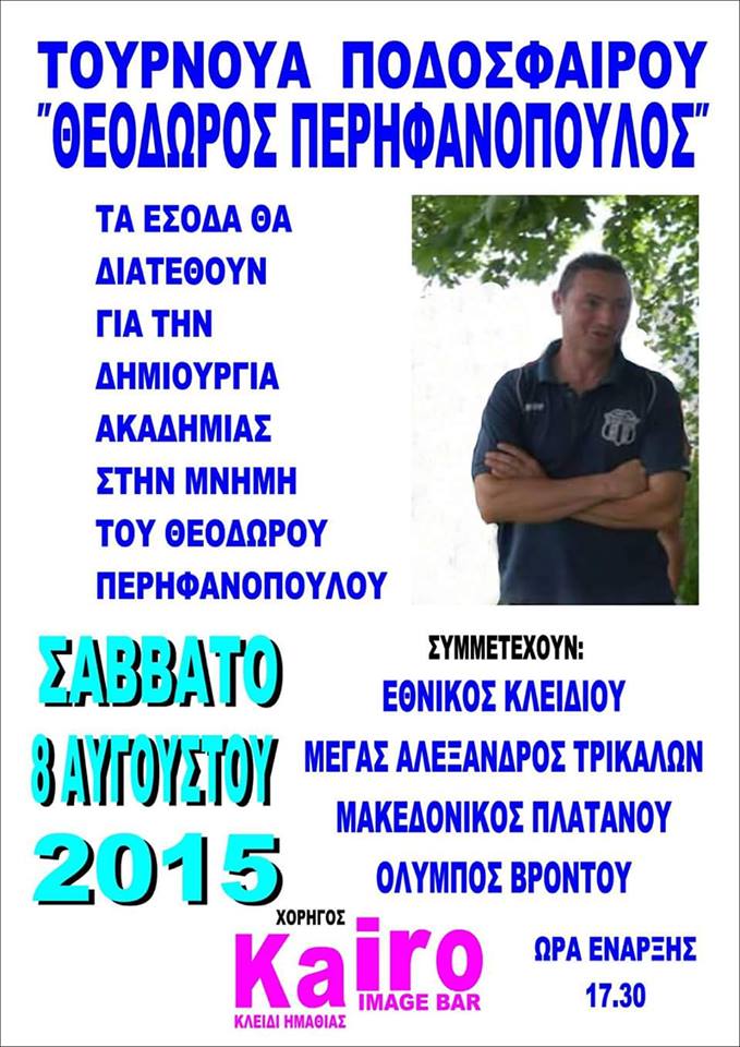 Ο ΕΘΝΙΚΟΣ ΚΛΕΙΔΙΟΥ σας προσκαλεί στο τουρνουά ποδοσφαίρου στην μνήμη του ¨ΘΕΟΔΩΡΟΥ ΠΕΡΗΦΑΝΟΠΟΥΛΟΥ¨ που θα διεξαχθεί το Σάββατο 8 Αυγούστου και ώρα 17.30 στο δημοτικό στάδιο Κλειδίου.