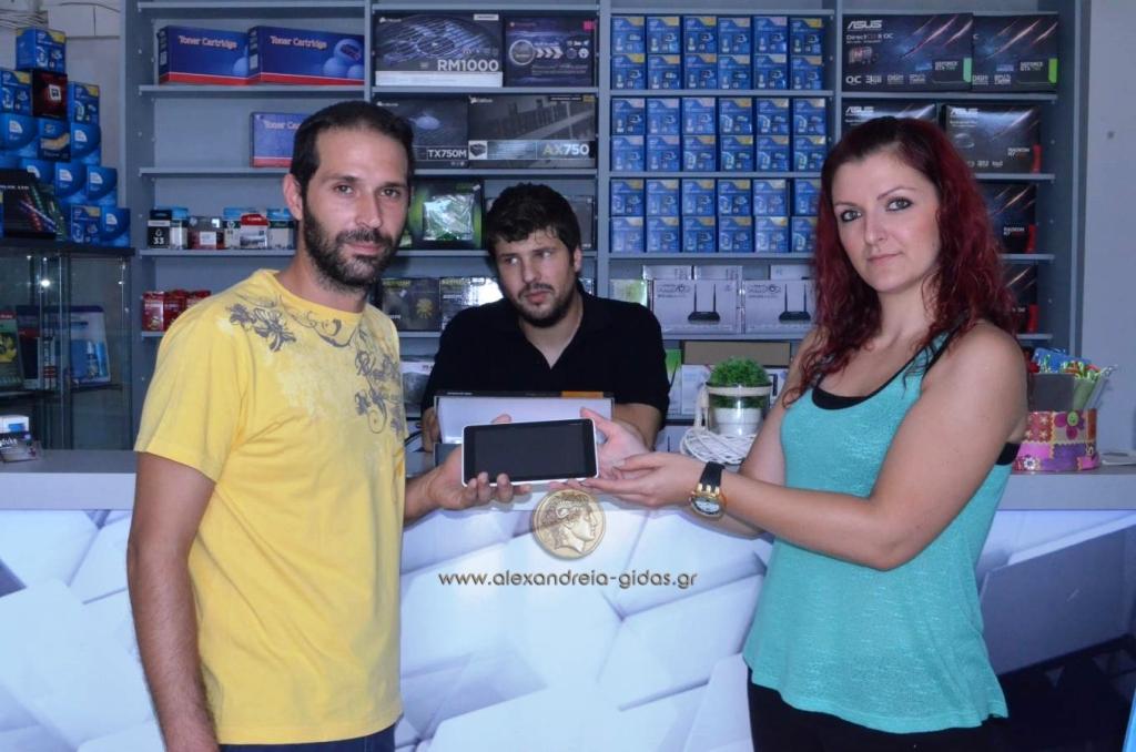 Τυχερός της κλήρωσης για ένα tablet στην κλήρωση του Αλεξάνδρεια-Γιδάς, προσφορά του καταστήματος DUKE PC STORE στην Ταγμ. Γεωργούλη 27 στην Αλεξάνδρεια, ήταν ο Γεωργόπουλος Σπήλιος.