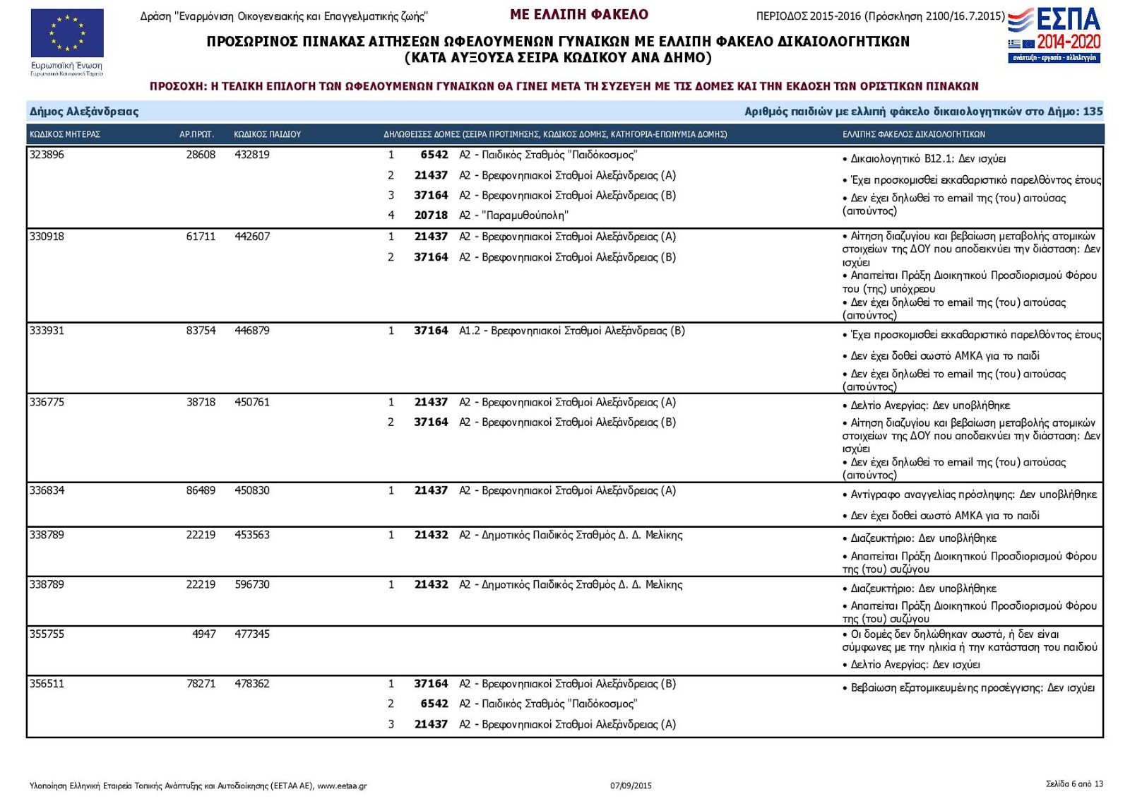 Η ΕΕΤΑΑ ανακοίνωσε τα αποτελέσματα και τους προσωρινούς Πίνακες Κατάταξης των δυνητικά ωφελουμένων αλλά και τους Πίνακες των απορριφθεισών μητέρων των παιδικών σταθμών ΕΣΠΑ 2015 – 2016.