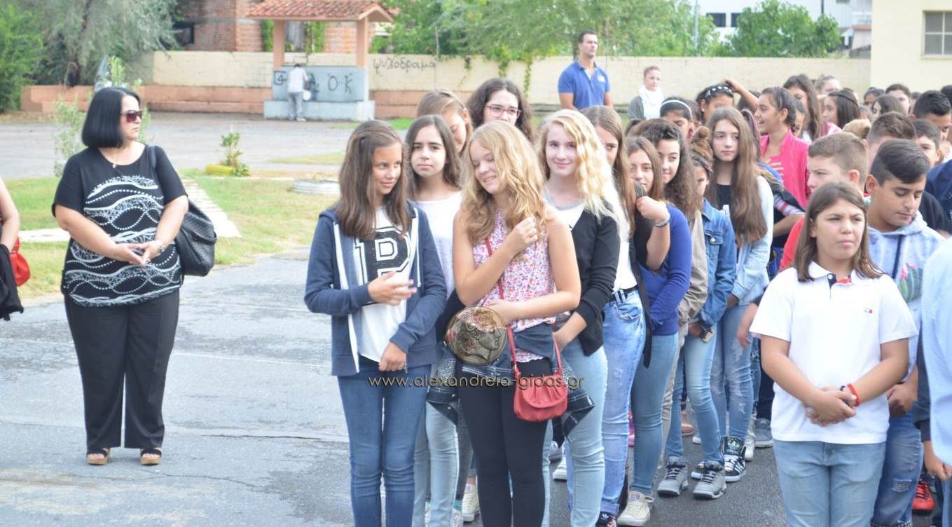 Οι μαθητές και των δύο σχολείων δέχτηκαν τις ευχές των διευθυντών τους για τη νέα σχολική χρονιά ενώ χαιρετισμό και ευχές απηύθυνε ο δήμαρχος Αλεξάνδρειας Παναγιώτης Γκυρίνης.