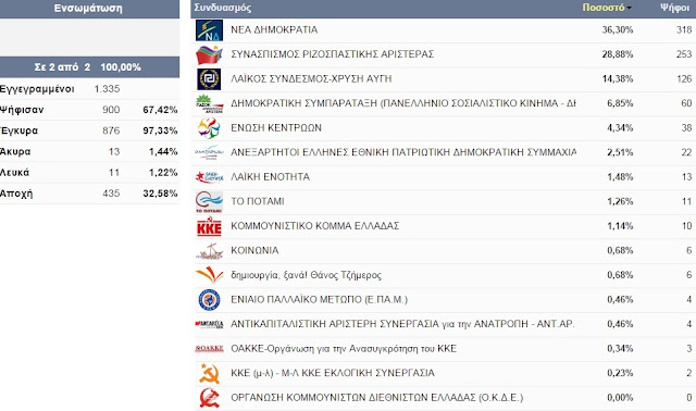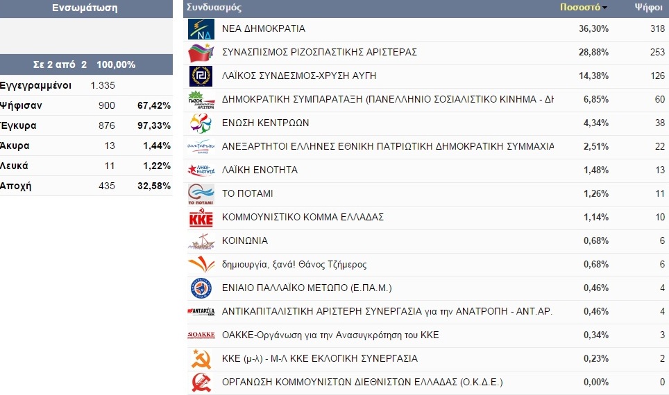 Την πρωτιά πήρε η Νέα Δημοκρατία ενώ το ποσοστό της αποχής έφτασε το 32,58%.