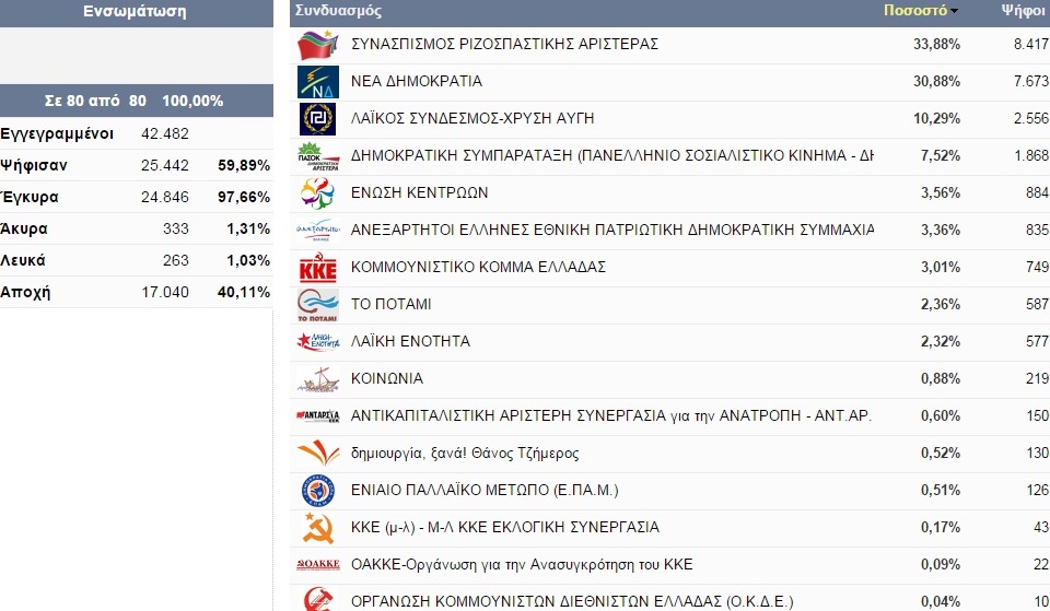 Με τρεις μονάδες (33,88% έναντι 30,88) πρώτος αναδείχθηκε ο ΣΥΡΙΖΑ. Τρίτο κόμμα η Χρυσή Αυγή που ξεπέρασε το 10%. Μεγάλο ποσοστό της αποχής που έφτασε το 40,11%
