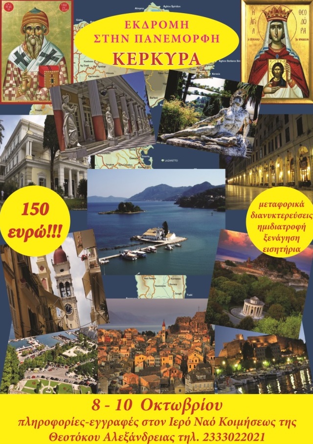 Ο Ιερός Ναός Κοιμήσεως της Θεοτόκου Αλεξανδρείας διοργανώνει τριήμερη προσκηνυματική εκδρομή στην Κέρκυρα, από τις 8 έως 10 Οκτωβρίου.