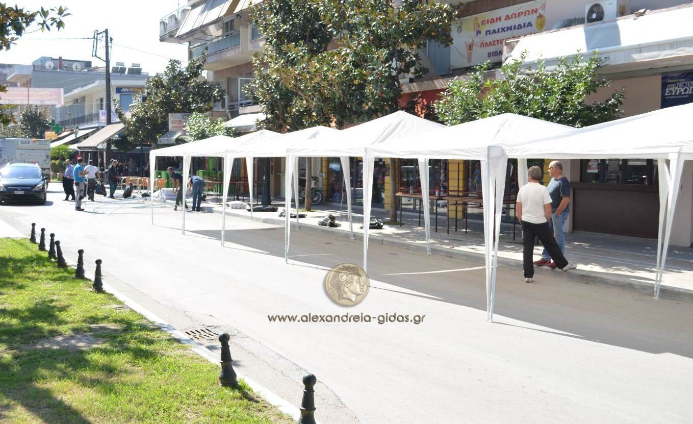 Συνεργεία του δήμου Αλεξάνδρειας στήνουν τα περίπτερα για την γιορτή που θα ξεκινήσει στις 7 το απόγευμα (κλικ για το πρόγραμμα ΕΔΩ).