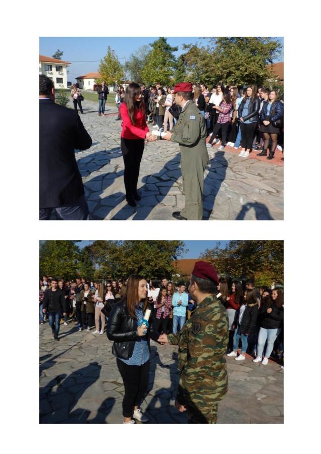 Ένα διαφορετικό τρόπο επέλεξαν στο ΓΕ.Λ. Πλατέος να τιμήσουν αυτή τη μέρα πραγματοποιώντας εκπαιδευτική επίσκεψη στο στρατόπεδο του 3ου Τ.Ε.Α.Σ. (Μακεδονομάχου Δημητρίου Πρόϊου) στο Παλιοχώρι. Στο χώρο αυτό, οι μαθητές και οι εκπαιδευτικοί, που έτυχαν της ιδιαίτερα θερμής υποδοχής και φιλοξενίας από όλους τους συντελεστές των στρατιωτικών μονάδων του στρατοπέδου, παρακολούθησαν στην αρχή το τελετουργικό για την ημέρα που περιελάμβανε: