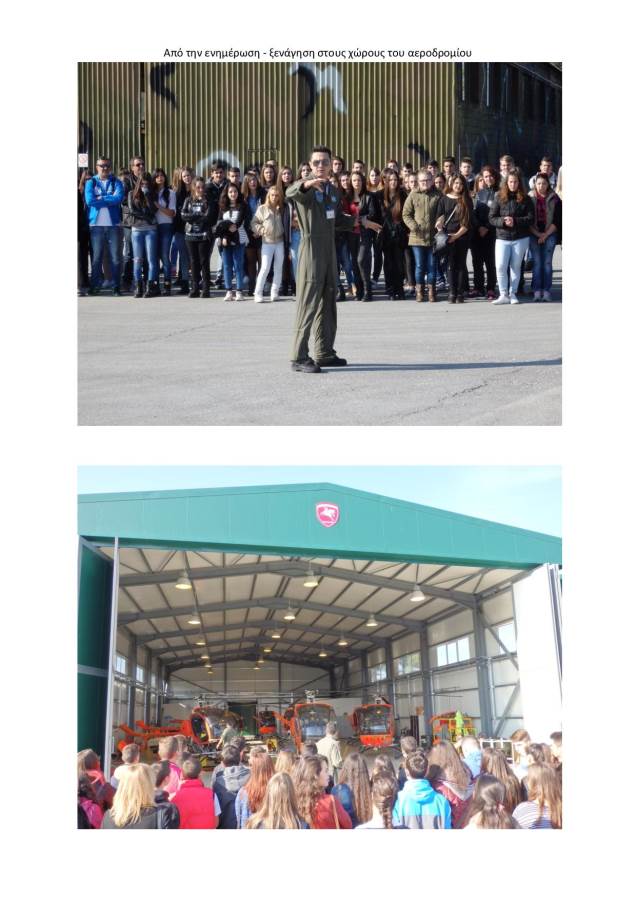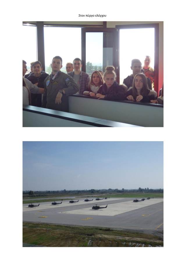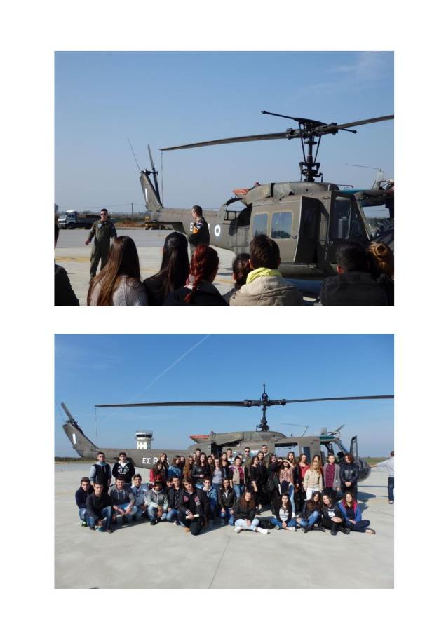 Στη συνέχεια, από στελέχη του στρατοπέδου, έγινε ξενάγηση στους χώρους του στρατοπέδου, ενημέρωση για τις εργασίες που γίνονται σε αυτούς, τον επιχειρησιακό ρόλο της μονάδας και των ελικοπτέρων. Ιδιαίτερη ήταν η βιωματική πληροφόρηση που είχαν οι μαθητές στην πίστα στάθμευσης των ελικοπτέρων με την επιβίβαση σε αυτά, όπως και στον πύργο ελέγχου του αεροδρομίου. Ο τρόπος παρουσίασης των δράσεων της μονάδας, η πληροφόρηση και ενημέρωση από τα στελέχη ήταν τόσο εμπεριστατωμένοι που τελικά ο χρόνος της επίσκεψης αποδείχθηκε λίγος με τους μαθητές να «ρουφούν» στην κυριολεξία κάθε πληροφορία από τα ερεθίσματα και τις παραστάσεις που λάμβαναν.