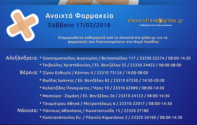 ΤΟΠΙΚΑ 17 Φεβρουαρίου, 2018 posted by admin Share Ανοιχτά φαρμακεία Ημαθίας Σάββατο 17 Φεβρουαρίου Αλεξάνδρεια: Αφήστε μια απάντηση Ακύρωση απάντησηςΗ ηλ. διεύθυνση σας δεν δημοσιεύεται. Τα υποχρεωτικά πεδία σημειώνονται με *Σχόλιο * Όνομα Email Ιστότοπος Αποθήκευσε το όνομά μου, email, και τον ιστότοπο μου σε αυτόν τον πλοηγό για την επόμενη φορά που θα σχολιάσω.
