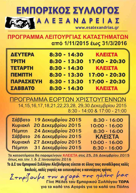 ΤΟΠΙΚΑ 30 Οκτωβρίου, 2015 posted by admin Share To χειμερινό πρόγραμμα των εμπορικών καταστημάτων Αλεξάνδρειας Ο Εμπορικός Σύλλογος Αλεξάνδρειας ανακοίνωσε το χειμερινό πρόγραμμα λειτουργίας των εμπορικών καταστημάτων της Αλεξάνδρειας. Το πρόγραμμα ισχύει από 1 Νοεμβρίου του 2015 μέχρι τις 31 Μαρτίου του 2016. Δείτε: Αφήστε μια απάντηση Ακύρωση απάντησηςΗ ηλ. διεύθυνση σας δεν δημοσιεύεται. Τα υποχρεωτικά πεδία σημειώνονται με *Σχόλιο * Όνομα Email Ιστότοπος Αποθήκευσε το όνομά μου, email, και τον ιστότοπο μου σε αυτόν τον πλοηγό για την επόμενη φορά που θα σχολιάσω.