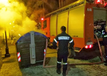 Στο σημείο έφτασαν οι πυροσβέστες και η αστυνομία. Οι πυροσβέστες γέμισαν τον κάδο με νερό για να σβήσει η φωτιά.