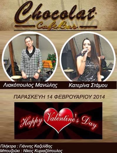 Σήμερα Παρασκευή, ημέρα των ερωτευμένων ζωντανή μουσική βραδιά με τους Μανώλη Λιακόπουλο και Κατερίνα Στάμου στις φωνές. Στα πλήκτρα ο Γιάννης Καζελίδης. Στο μπουζούκι ο Νίκος Κυριαζόπουλος.