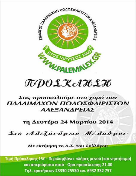 Ο Σύλλογος Παλαιμάχων Ποδοσφαιριστών Αλεξάνδρειας, διοργανώνει εκδήλωση στο ΑΛΕΞΑΝΔΡΕΙΟ ΜΕΛΑΘΡΟΝ, τη Δευτέρα 24/03/2014, στην οποία θα τιμήσει ποδοσφαιριστές της Αλεξάνδρειας, της περιόδου 1965-1975 και Προέδρους που δεν είχαν τιμηθεί στην προηγούμενη εκδήλωση.