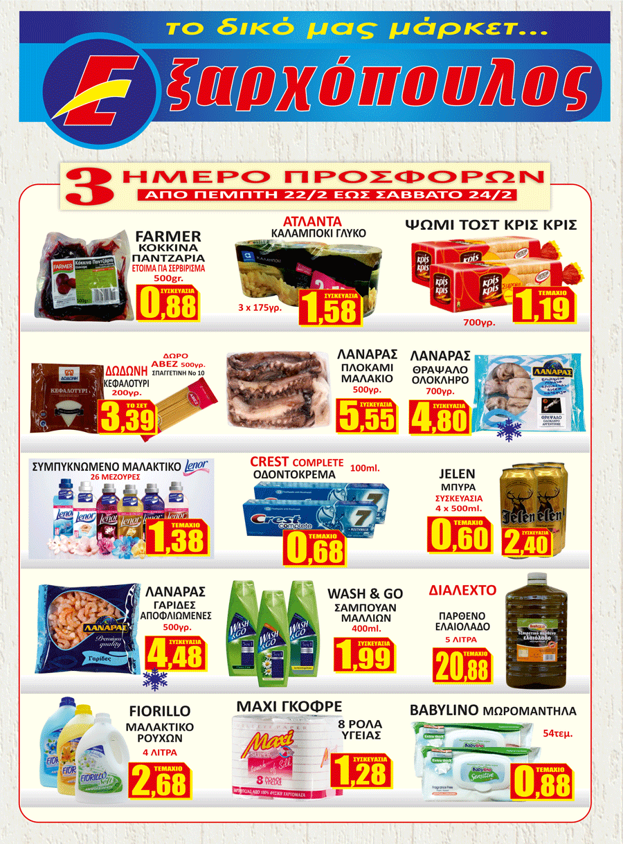 Το τοπικό σούπερ μάρκετ ΕΞΑΡΧΟΠΟΥΛΟΣ από την Πέμπτη 22 Φεβρουαρίου μέχρι και το Σάββατο 24 Φεβρουαρίου πρόσθεσε ξανά 15 +2 νέα έκτακτα προϊόντα στις προσφορές του καταστήματος!