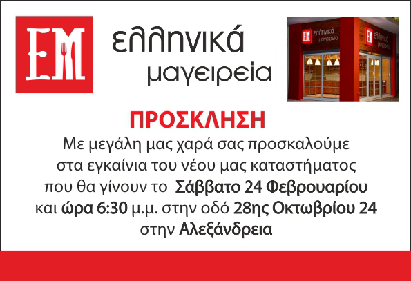 Τα ΕΛΛΗΝΙΚΑ ΜΑΓΕΙΡΙΑ πραγματοποιούν το Σάββατο 24 Φεβρουαρίου στις 18:30 τα εγκαίνιά τους στα οποία είστε όλοι καλεσμένοι!