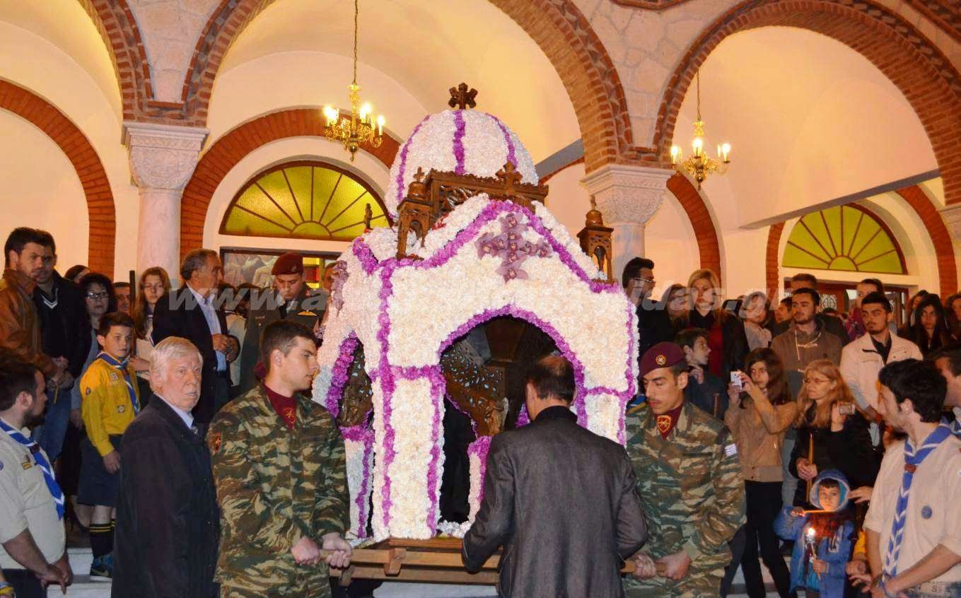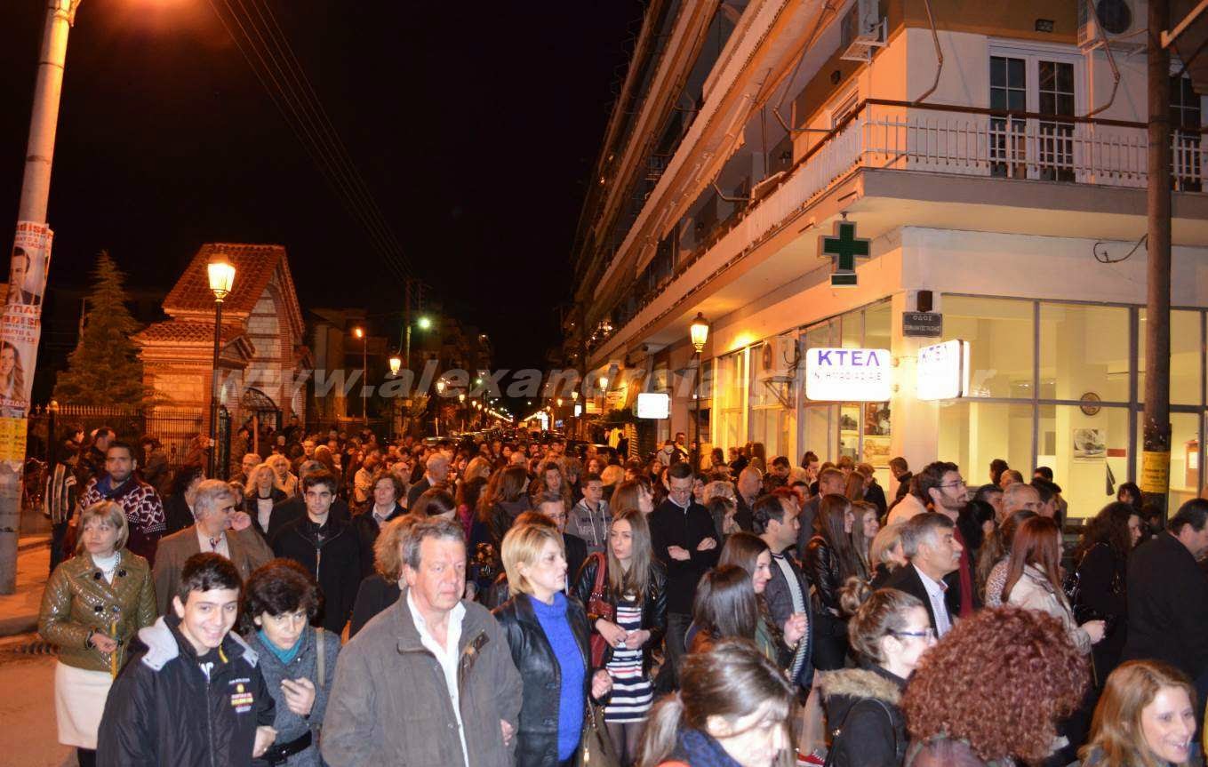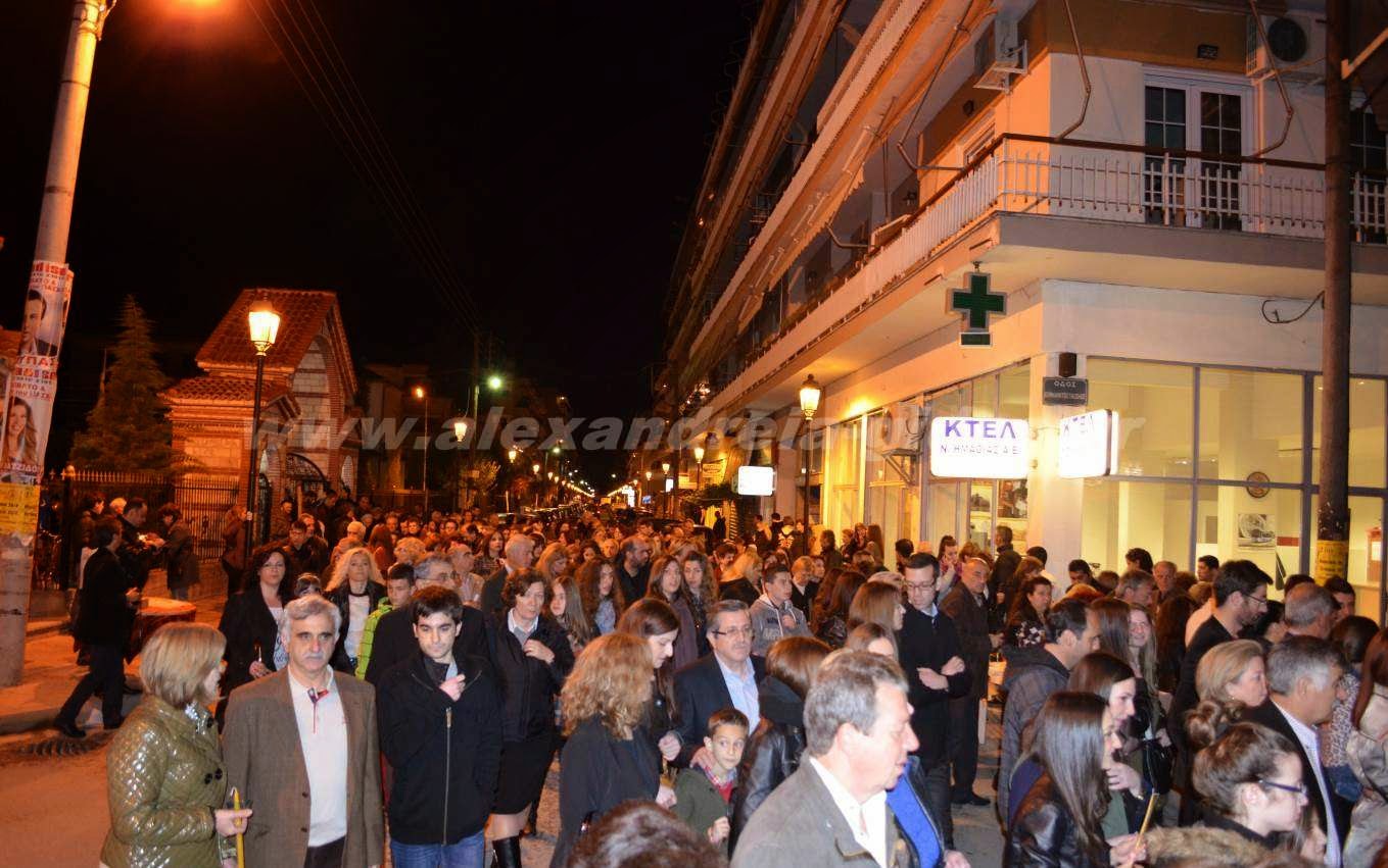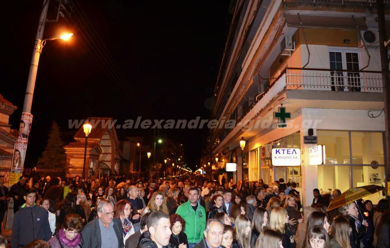 Με μεγάλη προσέλευση κόσμου πραγματοποιήθηκε και φέτος η περιφορά του Επιταφίου στον Ιερό Ναό Κοιμήσεως της Θεοτόκου στην Αλεξάνδρεια. Σε σύγκριση με την περσινή περιφορά που οι θερμοκρασίες ήταν σε υψηλά επίπεδα, φέτος εκτός από το κρύο υπήρξε και ψιλόβροχο το οποίο παρόλα αυτά δεν πτόησε τους αρκετούς συμπολίτες μας οι οποίοι κρατώντας κεριά ακολούθησαν την περιφορά του Επιταφίου στους δρόμους της Αλεξάνδρειας.