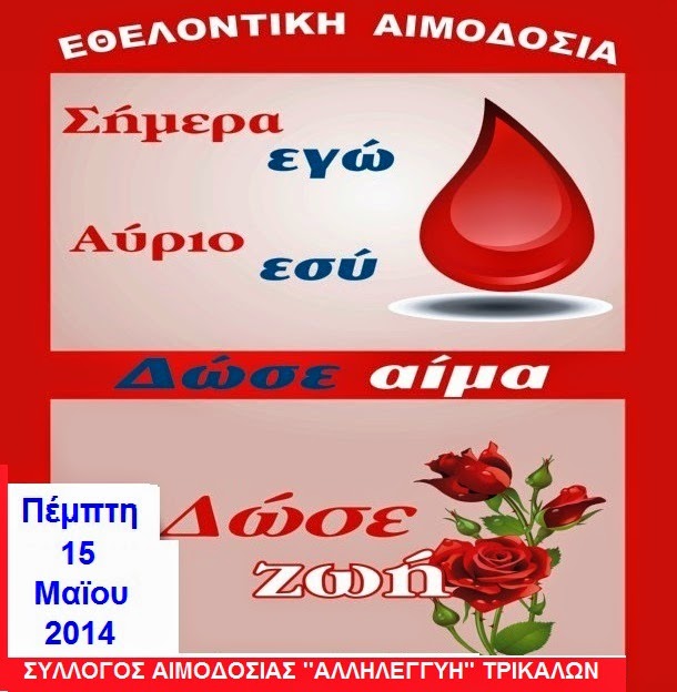 Λίγο πριν από τις εκδηλώσεις για τον εορτασμό της παγκόσμιας ημέρας του Εθελοντή Αιμοδότη, την 16η Εθελοντική Αιμοδοσία σε διάστημα τεσσάρων χρόνων θα πραγματοποιήσει ο Σύλλογος Αιμοδοσίας Τρικάλων, σε συνεργασία με το Νοσοκομείο Βέροιας.