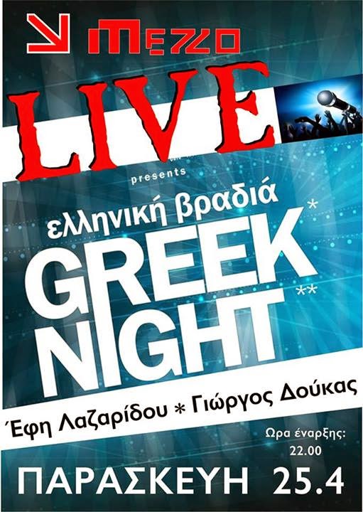 To ΜΕΖΖΟ All Day Bar σας προσκαλεί σήμερα Παρασκευή 25 Απριλίου σε Live Ελληνική βραδιά με τους Έφη Λαζαρίδου και Γιώργο Δούκα!