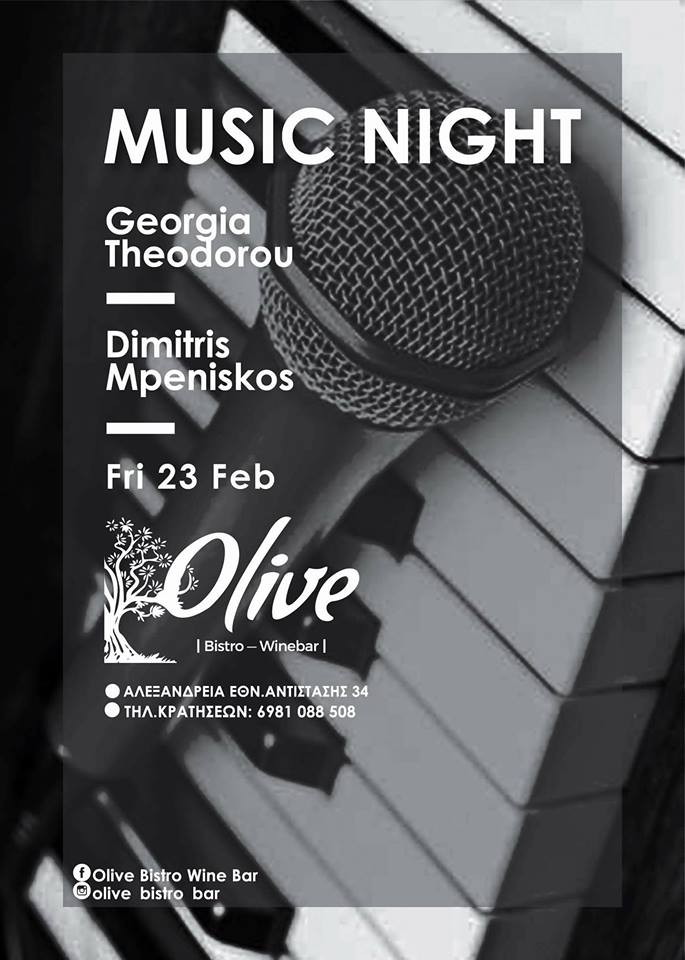 Σε μία ακόμα βραδιά ζωντανής μουσικής μας προσκαλεί σήμερα Παρασκευή 23 Φεβρουαρίου το OLIVE Bistro στον πεζόδρομο της Αλεξάνδρειας.