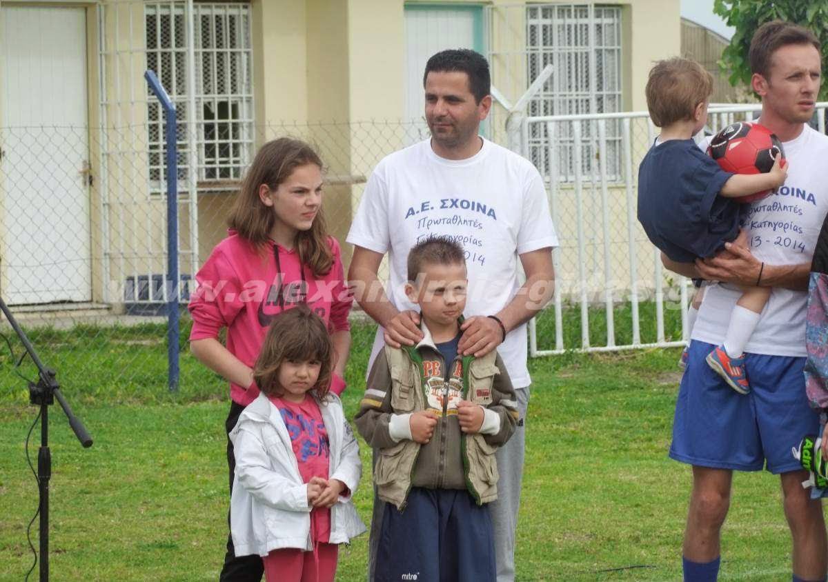 Σε φιλική αναμέτρηση με τους Παλαίμαχους Αλεξάνδρειας πραγματοποιήθηκε το απόγευμα της Δευτέρας η απονομή του κυπέλλου της πρωταθλήτριας ομάδας στη Γ΄ κατηγορία Ημαθίας, στην Α.Ε. Σχοινά.